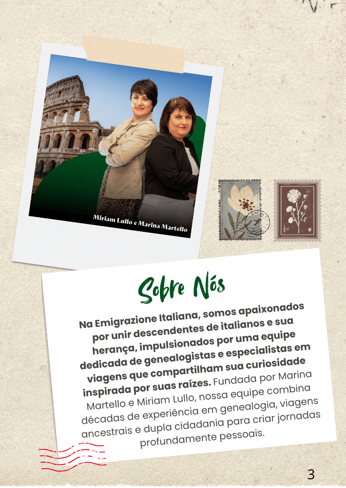 Já se perguntou onde começa a sua história italiana? Na Emigrazione Italiana, somos especializados em serviços de genealogia que dão vida ao passado da sua família. Desde o rastreamento de linhagens ancestrais por meio de arquivos históricos até a criação de um livro de história da família com curadoria impecável, desvendamos as histórias, tradições e rostos dos seus pais, avós e bisavós. Seja para um relatório de pesquisa detalhado ou uma lembrança atemporal que documente três gerações, nossos especialistas transformam registros empoeirados em um legado vívido. Pronto para seguir os passos dos seus antepassados?